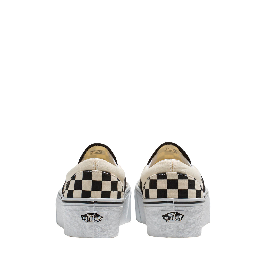 Tennis Slip-On DD unisex blanco y negro, con plataforma de 34 mm y suela waffle. Elaborados en lona con paneles elásticos laterales y cuello acolchado. Ofrecen estilo atemporal, confort y fácil calce.