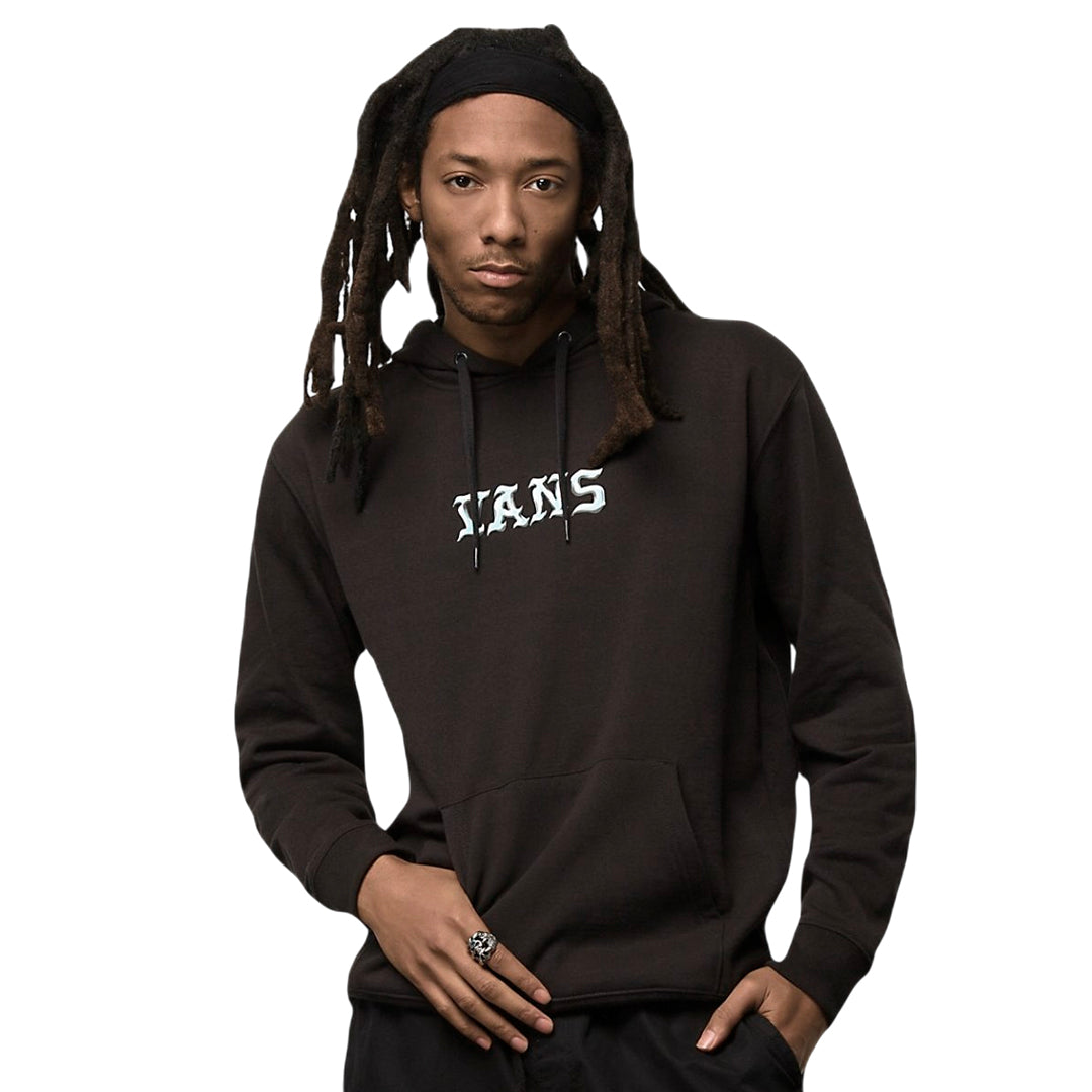 Hoodie Cross Bone para hombre color negro, marca VANS. Fleece 60% algodón y 40% poliéster con logo frontal y gráfico de calaveras cruzadas en la espalda.